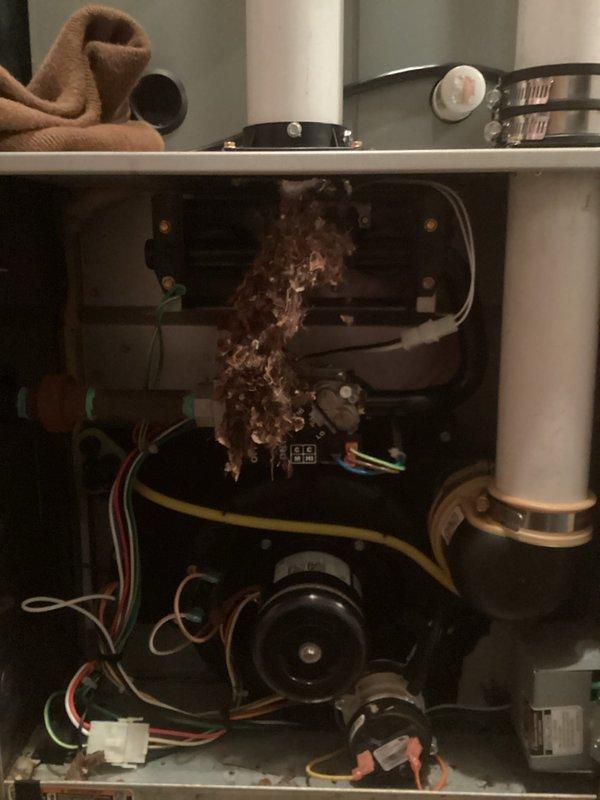 Responded to no-heat service call and found significant dust and debris accumulation inside the furnace, particularly affecting the blower assembly. Removed accumulated material, cleaned components, and restored proper operation of the heating system.