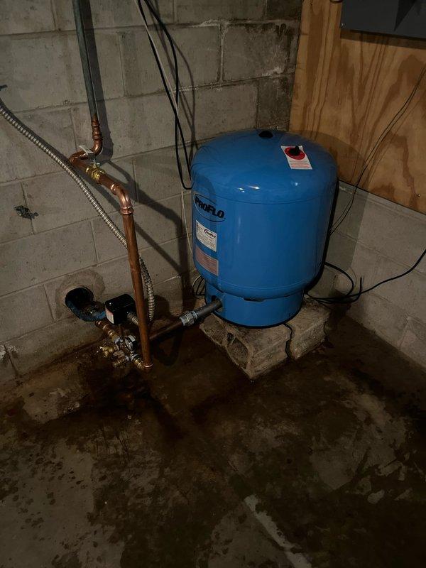 Responded to report of recurring well tank leak. Upon inspection, found blue pressure tank in basement utility area with connected copper piping, brass fittings, and valves showing signs of previous moisture issues based on floor staining. Evaluated pressure tank system, plumbing connections, and associated components to identify source of leak. Documented existing conditions including tank installation on concrete block platform, pressure gauge assembly, and flexible conduit connections for system assessment and repair recommendations.