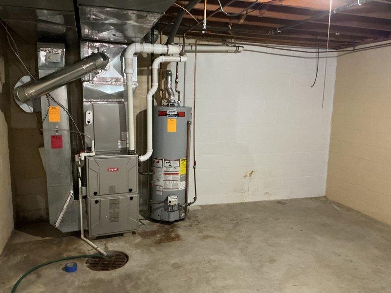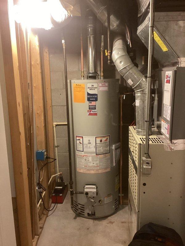 Performed on-site assessment of existing water heater requiring replacement in basement utility area. Evaluated current 40-gallon unit installation, documented all plumbing connections including galvanized and copper supply lines, PVC drainage system, and electrical requirements. Photographed equipment configuration and surrounding mechanical room infrastructure to provide accurate replacement estimate and ensure proper sizing for new unit installation.